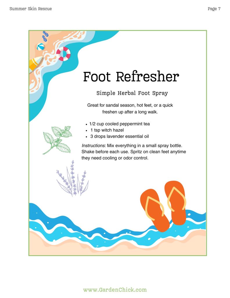 Summertime means sandals, sunshine—and sometimes tired, overheated feet. If you’ve been in the garden, at the beach, or just running around in flip-flops, this simple herbal spray will give your feet the refresh they need.