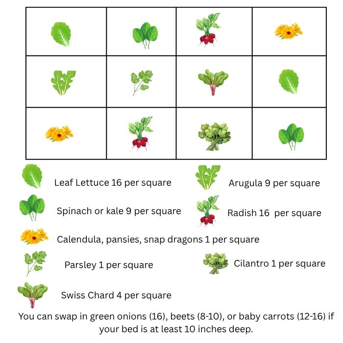To make the most of your space, divide your 3×4 bed into 12 squares (1 square foot each). Here’s a sample planting plan that mixes vegetables, herbs, and flowers:
