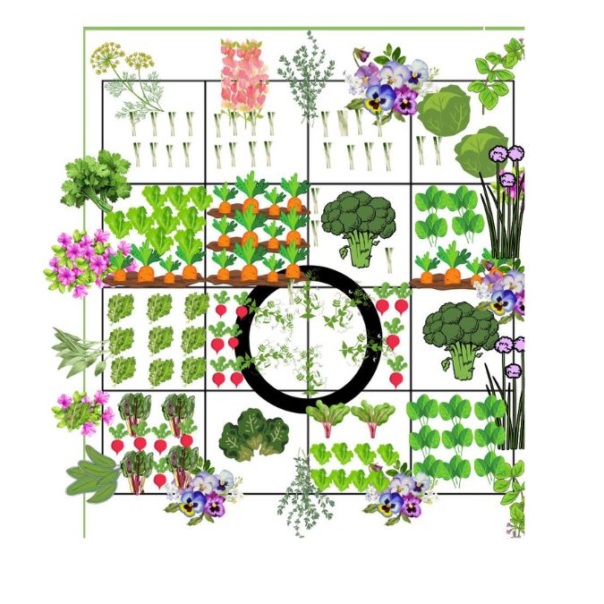 Look how many spring vegetables you can grow in this one 4×4 bed. Flowers, herbs, lettuce, kale, broccoli, Swiss chard, radishes and more! And that’s before you even start growing up. This garden plan shows sugar snap peas growing up an obelisk.